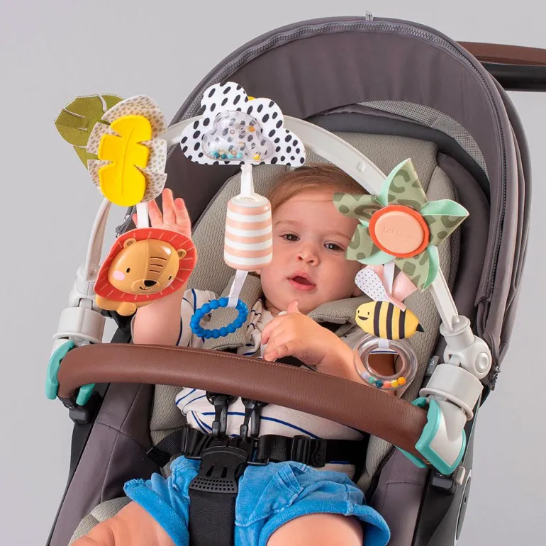 Sorprende a tu bebé con este conjunto de actividades que estimularán sus sentidos. Sonajeros, contrastes de color, distintas texturas, anillo de dentición… Todo tipo de elementos que podrá explorar con manos y boca desarrollando así su coordinación ojo-mano, ¡mientras disfruta de un agradable paseo!