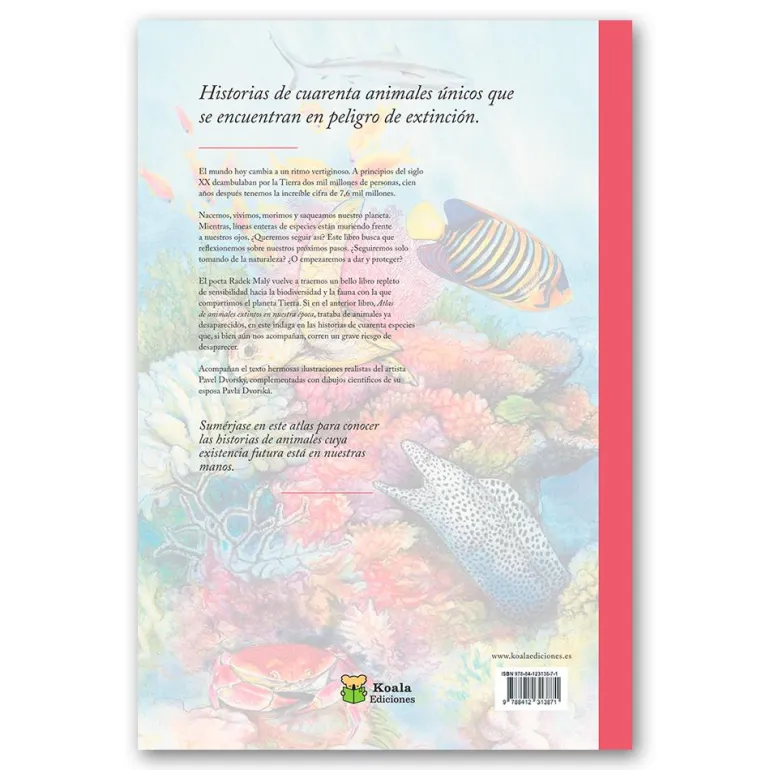Este imprescindible álbum describe poéticamente la historia de 40 especies de animales en peligro de extinción. Se trata de un bello libro repleto de sensibilidad hacia la biodiversidad y la fauna con la que compartimos el planeta Tierra. Entre las especies que componen el libro encontraremos al lince, al dragón de Komodo, el lémur, el diablo de Tasmania o la vaquita marina, entre otros.