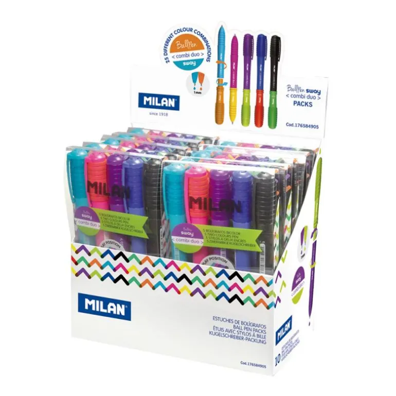Colores: azul, rojo, negro, verde, lila, verde claro, rosa, amarillo, azul claro y naranja. El estuche permite doblar la tapa y disponer los bolígrafos de forma cómoda, utilizándolo como expositor de sobremesa.