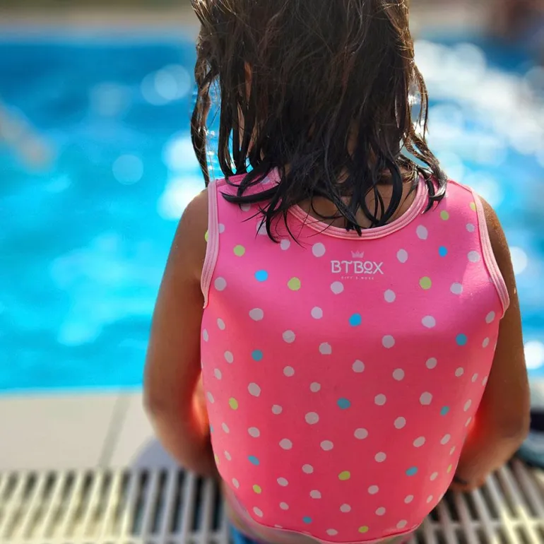 Disfruta de un buen chapuzón de forma segura con este alucinante chaleco con diseño de lunares de colores sobre fondo rosa. ¡Abróchalo y refréscate mientras te diviertes sin preocupaciones!