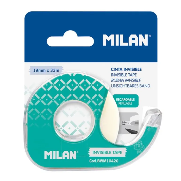 Rollo de cinta adhesiva invisible de 19 milímetros de ancho y 33 metros de longitud, que viene presentada en un dispensador recargable con un alegre diseño de color turquesa. Con hoja de corte metálica. La cinta tiene un acabado mate, que proporciona un agradable tacto y, además, permite escribir encima.