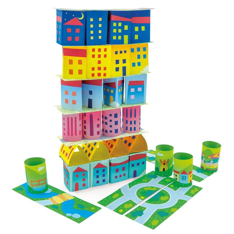 Ensambla las piezas de papel y crea, bloque a bloque, una bulliciosa ciudad repleta de colorido. ¡Manos a la obra!