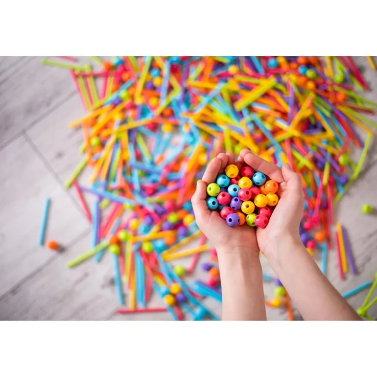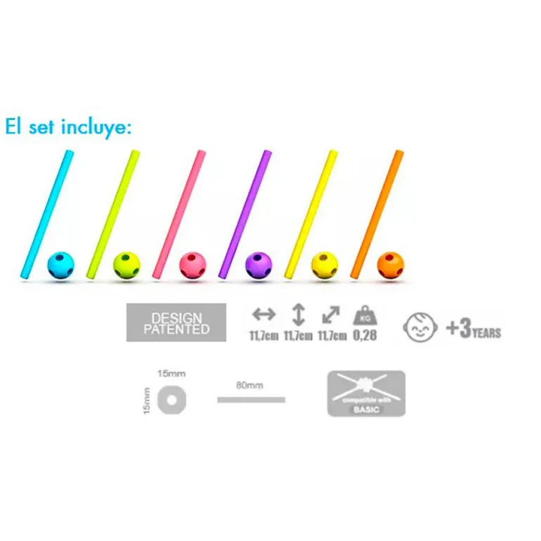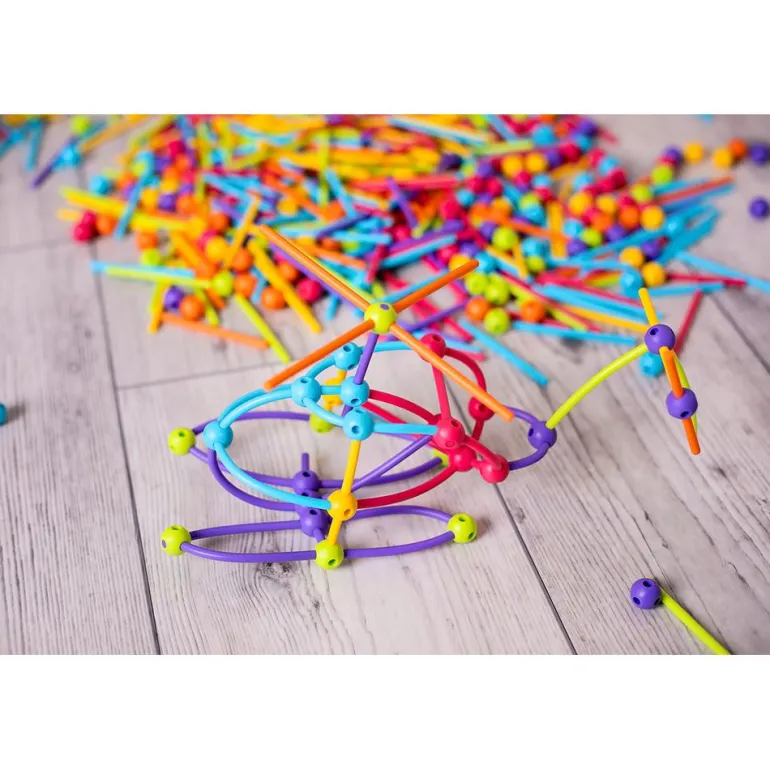 Las varillas son flexibles y están hechas a base de plástico suave, flexible y totalmente seguro, y se unen entre sí con las pequeñas esferas de colores. Cada esfera dispone de 6 agujeros para que se puedan conectar varias varillas en distintas direcciones, ¡las posibilidades de construcción son infinitas! Niños y niñas desarrollarán su habilidad manual, motricidad fina, su atención, el pensamiento lógico, la visión espacial y el razonamiento matemático casi sin darse cuenta, ¡es ideal también para compartirlo en el aula!