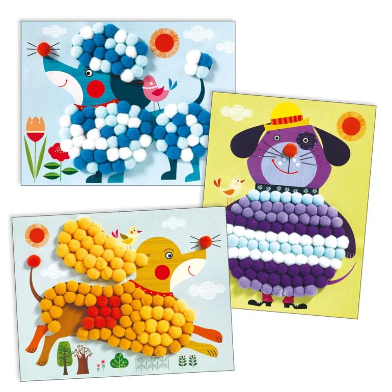 Llena de color estas láminas con ilustraciones de perros, pegando fácilmente los pompones de colores, ¡el resultado es de lo más glamuroso!