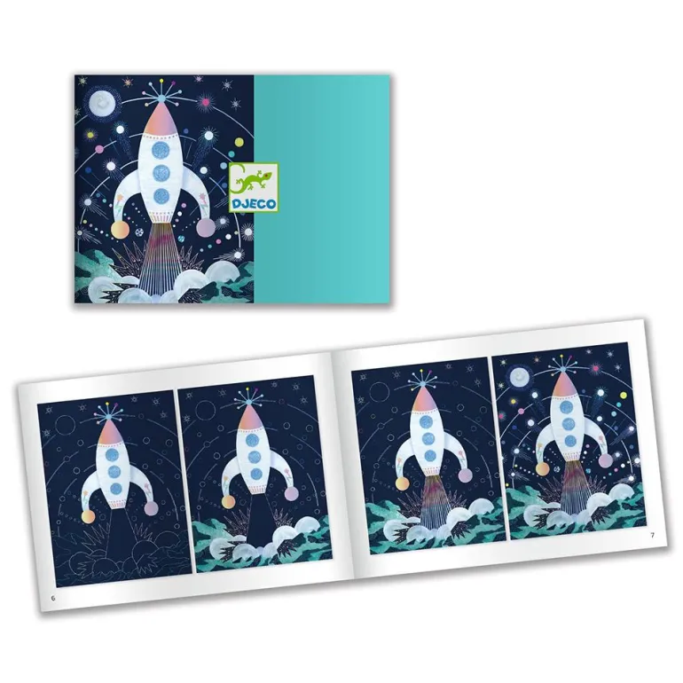 Elige una lámina y descubre la ilustración rascando la superficie con un varilla de madera. Déjate sorprender por los detalles iridiscentes, ¡fácil y divertido!