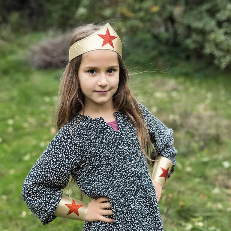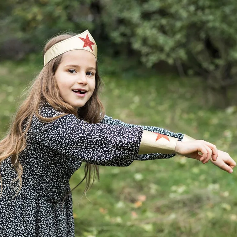El brillante color dorado y las deslumbrantes estrellas rojas de estos accesorios lo dicen todo sobre su portadora: se trata de una superheroína capaz de ayudar a quien lo necesite, fuerte como nadie y tan valiente que no teme enfrentarse a las injusticias, ¡conviértete en ella e imagina mil aventuras!