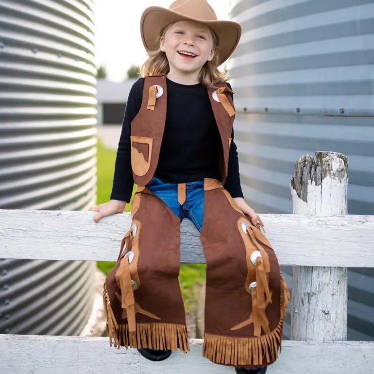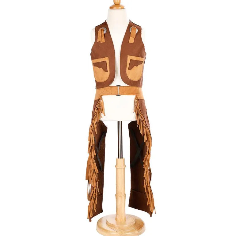 Con este alucinante traje compuesto por chaleco y chaparreras, te convertirás en la vaquera más audaz o el vaquero más intrépido de todo el Oeste, ¡prepárate para guiar a tu ganado a través de las llanuras!