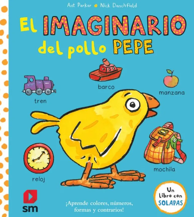 Un imaginario con solapas para que los niños aprendan los números, los colores, las formas y los contrarios con el pollo Pepe y sus amigos.