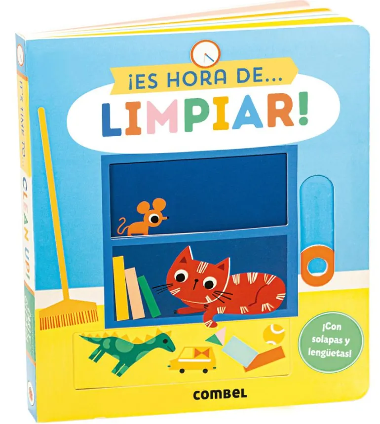Un libro interactivo, todo cartón, con solapas y lengüetas para ayudar a los más pequeños a imitar a los adultos en sus tareas cotidianas, como la de limpiar. Cada doble página presenta una tarea de casa: simularán que pasan la aspiradora, lavan los