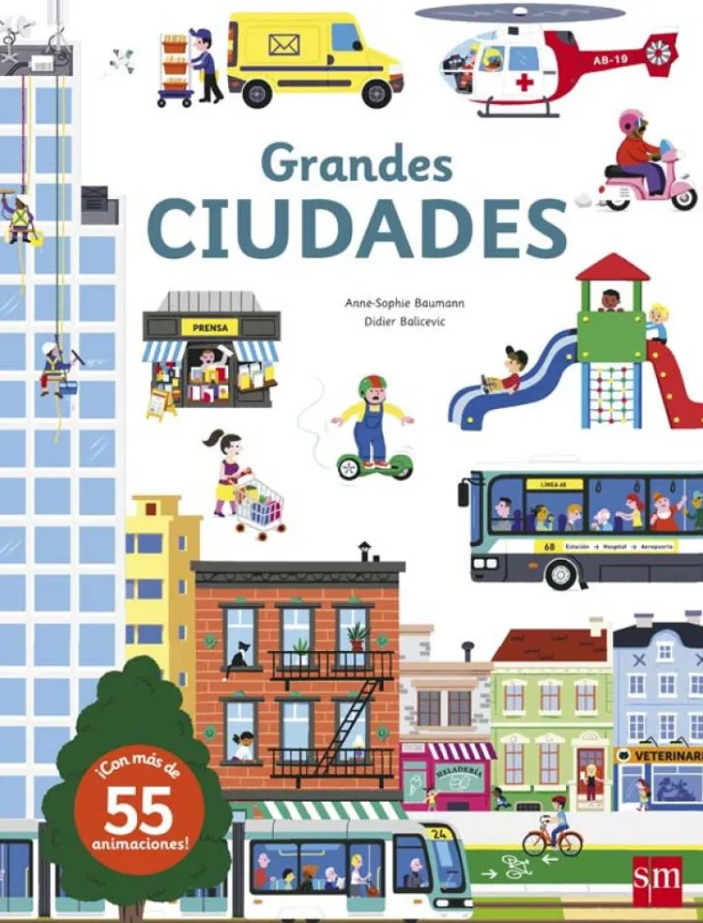 Un libro sobre las ciudades con más de 55 animaciones para descubrir cómo funciona el tráfico, averiguar de dónde vienen la luz o el agua de una ciudad, explorar las habitaciones de un hospital, subir y bajar en el ascensor de un centro comercial… En definitiva, una completa guía con solapas, ruedas y elementos móviles para que comprendas bien cómo es la vida en las grandes ciudades y descubras todos sus secretos.