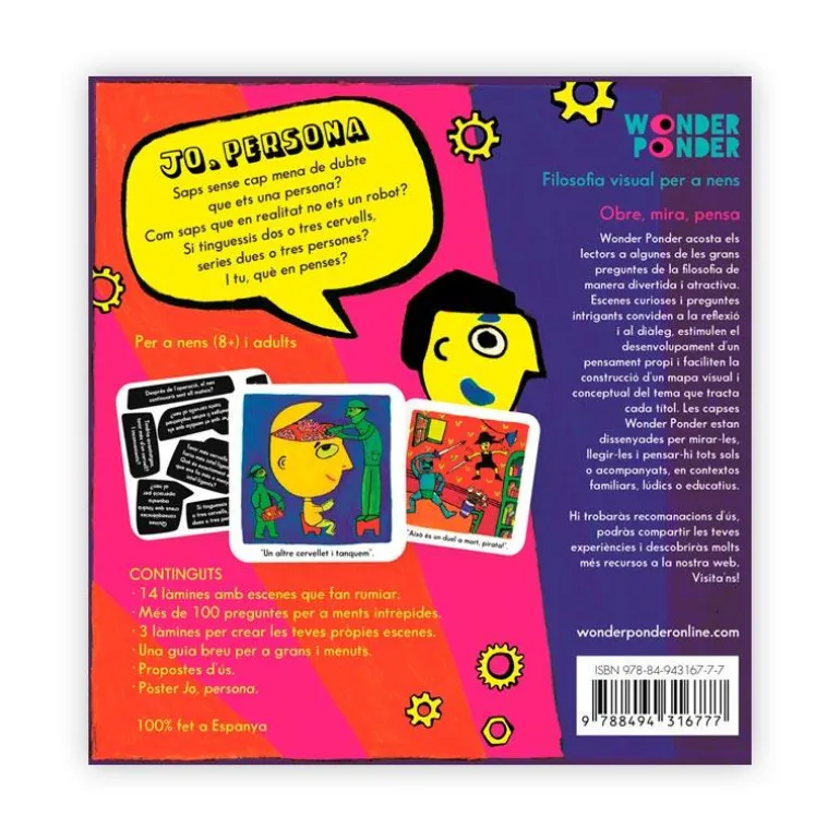 Saps sense cap mena de dubte que ets una persona? Com saps que en realitat no ets un robot? Si tinguessis dos o tres cervells, series dues o tres persones? I tu, què en penses? Jo, persona és un llibre-joc presentat dintre d’una capsa, que indaga sobre qui som i què som amb humor, curiositat i rigor. CONTINGUT DE LA CAPSA· 14 Làmines amb escenes il·lustrades· Més de 100 preguntes formulades amb cura per a suscitar una reflexió rica i ben orientada, sense dirigir-la cap a cap conclusió predeterminada.· 3 làmines en blanc que inviten a dibuixar escenes filosòfiques i a plantejar les pròpies preguntes.· Guia d?acompanyament a la lectura per a menuts i grans.· Propostes d?ús.· Pòster temàtic Wonder Ponder (A3).