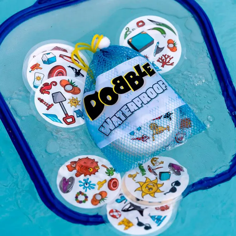 Prepárate, observa… ¡y sé el más rápido en encontrar el objeto que coincide entre las cartas y nombrarlo en voz alta! Esta versión del clásico Dobble, perfecta para viajar, contiene cartas impermeables.