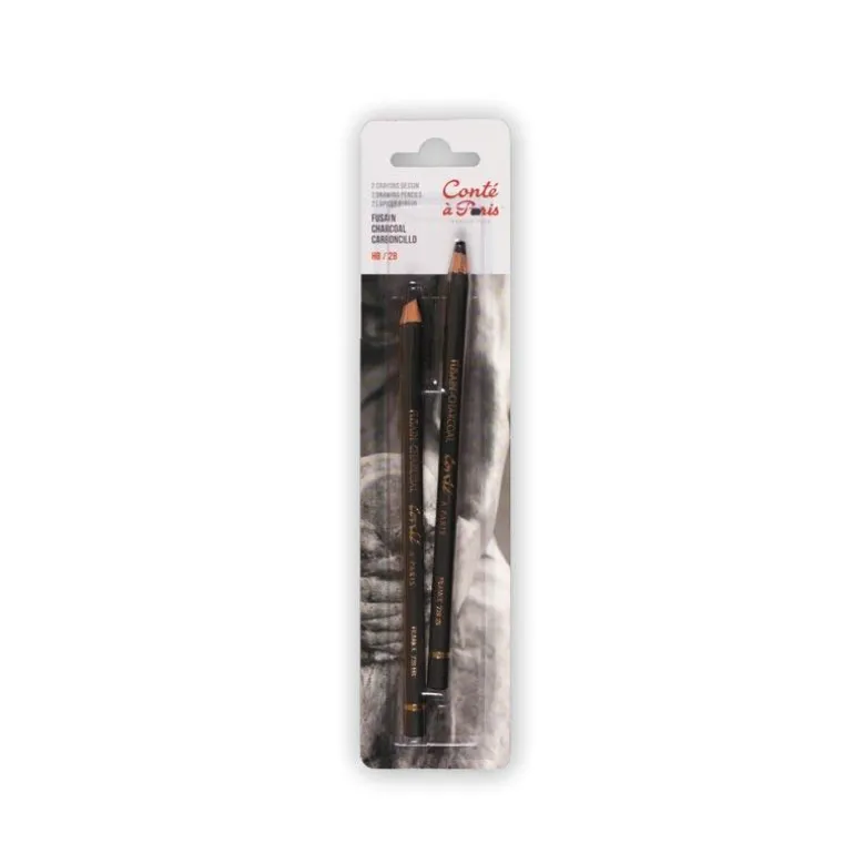 Blíster de dos lápices de carbón para dibujo artístico, que permite un trazo seco y denso en un negro intenso. Graduación HB y