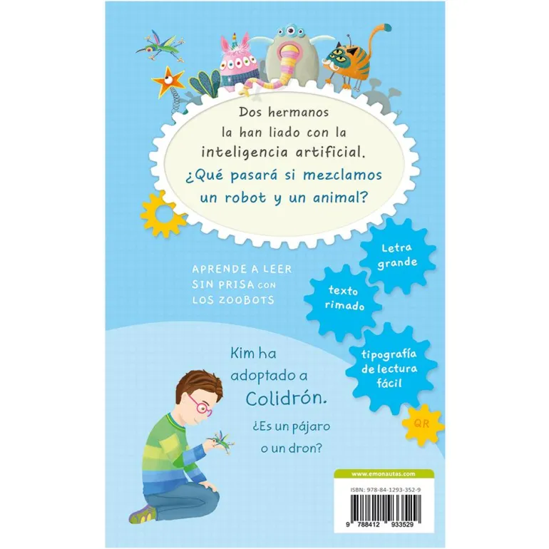 Una tarde, Elena y Enzo se colaron a jugar en el taller de sus padres y la liaron a lo grande con la inteligencia artificial. Fue por culpa de una idea: «¿qué pasará si se mezcla un robot con un animal?»… Y nacieron Los zoobots.Kim ha adoptado al zoobot Colidrón y está deseando ir al parque a hacerlo volar. Pero no consigue dirigir bien al zoobot y todos los vuelos son un desastre. ¿Estará estropeado el control remoto? Una colección para aprender a leer sin prisa. En minúsculas, con letra grande y bien espaciada, tipografía de lectura fácil y texto rimado. En cada cuento te esperan nuevos personajes.