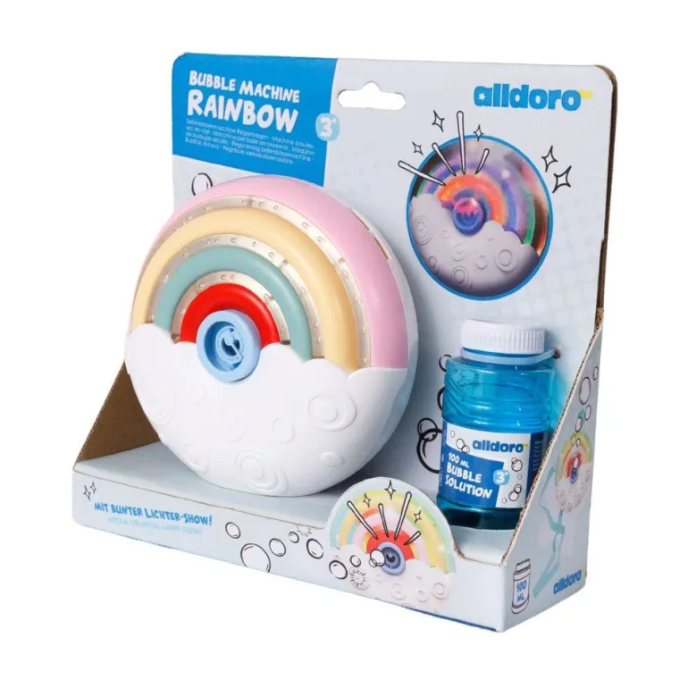 Crea una mágica nube de pompas y pásalo en grande observando cómo flotan y se mueven o jugando a cazarlas antes de que exploten, ¡esta genial máquina en forma de arcoíris hará un millón de pompas para ti!