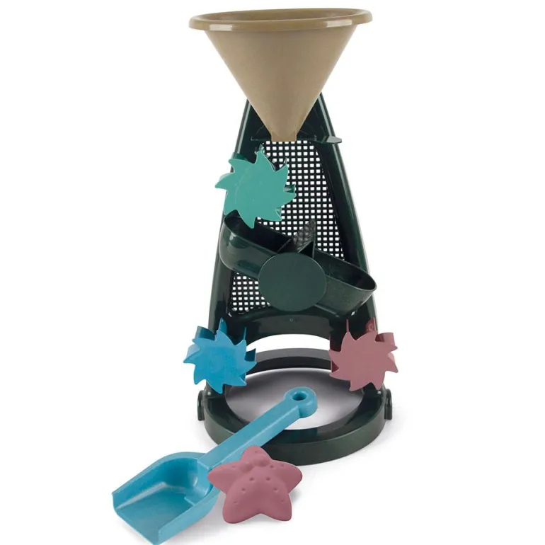 En el gran embudo que tiene en la parte superior se puede verter agua y observar cómo se ponen en movimiento las ruedas y el depósito oscilante, ¡será divertidísimo observar el recorrido que hace el agua! Incluye una pequeña pala y un molde para completar el set y favorecer la imaginación de los más pequeños.