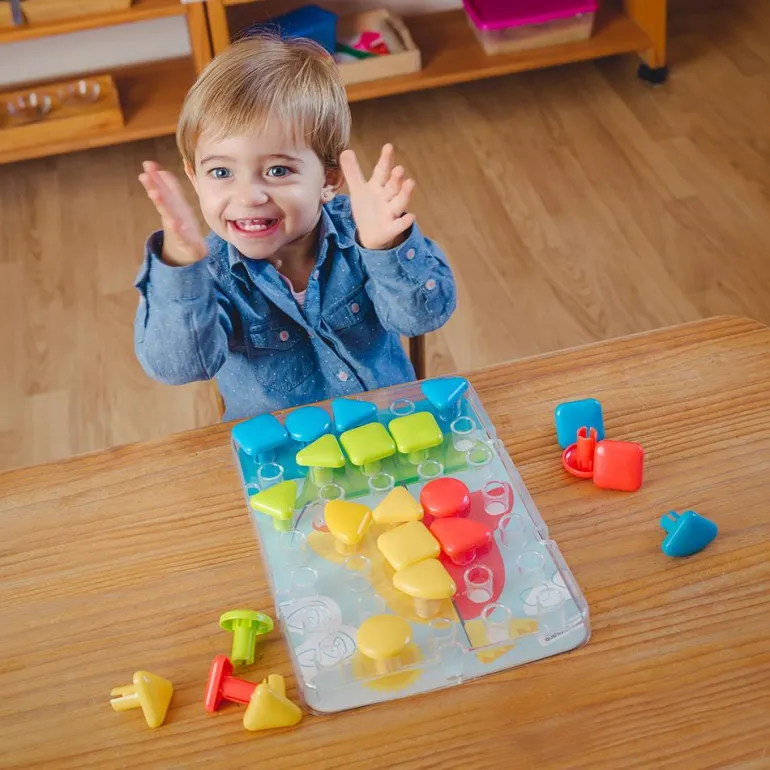 Es un divertido juego que nos permite ejercitar la coordinación óculo manual, la motricidad fina y la orientación espacial. Podemos realizar ejercicios de asociación, reconocimiento de colores y formas.