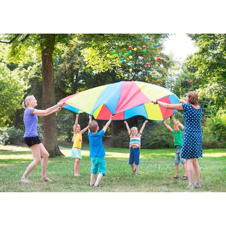 Diviértete en grupo con este genial set de paracaídas con pelotas, ¡llegó el momento de poneros a prueba con un sinfín de actividades en grupo de lo más desternillantes!