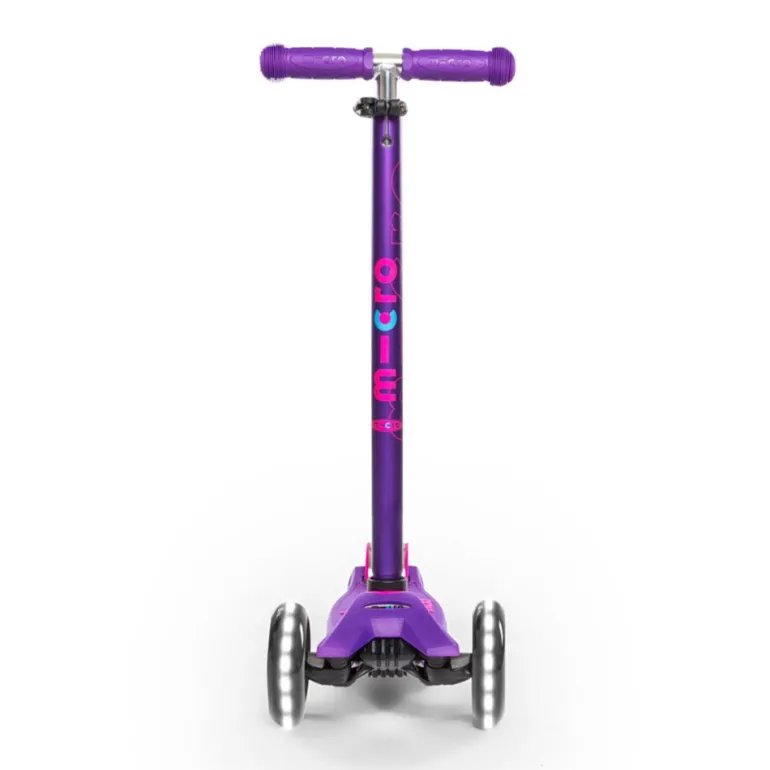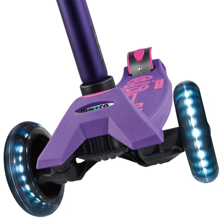 Disfruta de tus paseos en patinete con este increíble modelo Maxi Micro Deluxe en color lila, con manillar extensible… ¡y con luces LED en las ruedas!