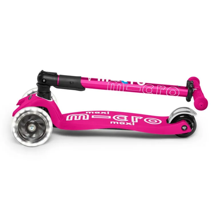 Disfruta de tus paseos en patinete con este increíble modelo Maxi Micro Deluxe plegable en color rosa, con manillar extensible… ¡y con luces LED en las ruedas!