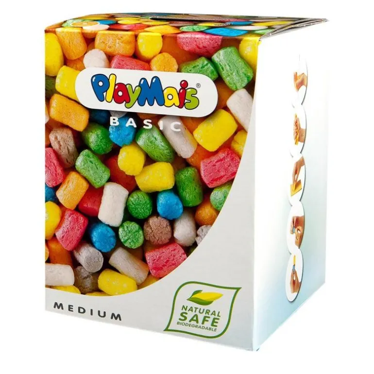 ¡Una caja llena de creatividad! Imagina creaciones alucinantes en tres dimensiones, pero realizadas con piezas de colores vistosos, respetuosas con el medio ambiente, ligeras y muy fáciles de utilizar desde muy pequeños… ¡Eso es Playmais! Este original juego de construcción y modelado está compuesto por copos multicolores fabricados con maíz, agua y colorante alimentario, para darles diferentes tonalidades: son naturales, ecológicos y totalmente biodegradables. Utilizarlos es realmente sencillo: Se pueden unir entre sí simplemente humedeciendo el extremo que queremos unir, sin más herramientas podremos construir desde un castillo hasta nuestros animales favoritos. Imagina la forma que necesitas que tenga cada copo, y aprieta, enrolla, corta, rasga, pinta, perfora y adhiere a cartón, cartulina, papel, madera, o pórex; ¡Los copos se unen entre sí como por arte de magia y sin necesidad de pegamento, gracias al almidón natural del maíz! Son ideales para el aprendizaje de los más pequeños: estimulan el desarrollo de la creatividad, la imaginación, la comprensión espacial, la lógica y la motricidad. No son comestibles. Fabricados en Alemania, han sido premiados con el ToyTalk Awards 2009 y con el Good Toy Award 2009. La caja incluye 300 piezas de colores surtidos, guía de juego a color y accesorios. A partir de 3 años.
