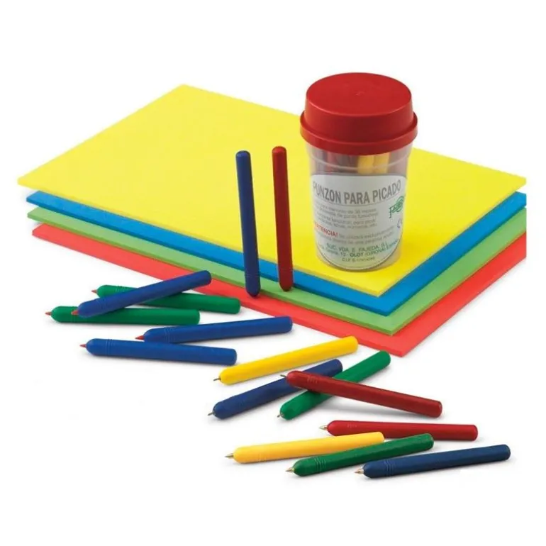 El cuerpo de plástico es muy resistente y seguro y la punta metálica aporta precisión, e incluye un relieve en la parte inferior para una mejor sujeción. Son perfectos para trabajos de picado en el que los más pequeños desarrollarán su motricidad fina.