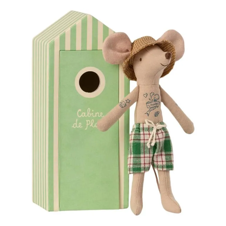 Este fascinante modelo de Maileg incluye un ratón de algodón de tamaño mediano, vestido con atuendo de bañista cosido a mano y un sombrero. Va acompañado de una fantástica caseta de playa con estampado de rayas marineras. Resulta perfecto para disfrutar del juego simbólico e imaginativo, pero también como elemento decorativo. ¡Dale a tu cuarto un aire atemporal y mágico, mientras disfrutas de la compañía de este pequeño amigo!