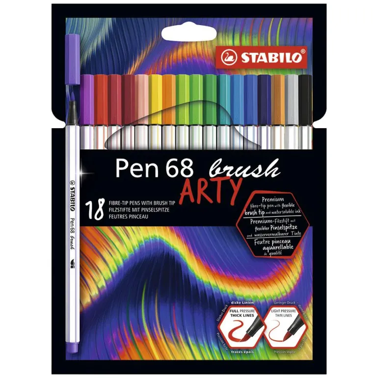 Este set de rotuladores Stabilo Pen 68 con punta de pincel, se convertirá en el aliado perfecto para todos tus diseños y dibujos, ¡podrás perfeccionar varias técnicas con esta caja de 18 colores!