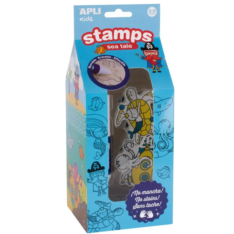 Con los sellos cuentos del mar ¡verás a las criaturas del fondo marino en plena acción!, sirenas, submarinos, capitanes de barco.. El set incluye 6 sellos con temática marina, una almohadilla de tinta de color negro y un rotulador borraor para limpiar la tinta de tejidos y muebles. A partir de 3 años.