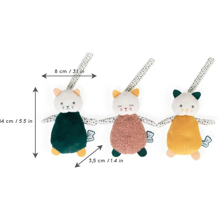 Cada uno de los gatitos de este set tiene una textura diferente, uno cruje, otro es ligero y el otro cuenta con un poquito más de peso. El contraste de sus colores hará que el bebé estimule su vista, además son muy suaves por lo que están listos para pasar horas y horas de diversión junto a tu pequeño o pequeña.