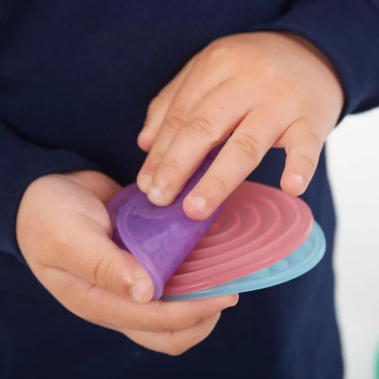 Un juego genial diseñado para explorar, descubrir y desarrollar la estimulación sensorial táctil. Favorece el crecimiento de los más pequeños y pequeñas de la casa, mejora la capacidad de asociación, la coordinación y propicia el movimiento pasando de círculo a círculo. Esta fabricado en silicona flexible, y es apto para lavarlo con agua y jabón, o incluso ¡en el lavavajillas!.