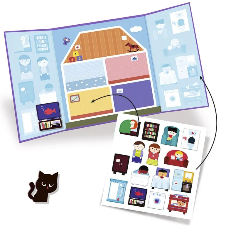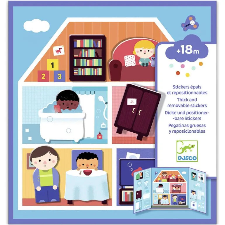 Este escenario con forma de tríptico ayudará a que los más pequeños entiendan el funcionamiento de la casa y se familiaricen con el vocabulario relacionado con ella, al tiempo que desarrollan al máximo su creatividad y sus habilidades narrativas y sociales, estimulando su capacidad artística de la manera más divertida. Las pegatinas son gruesas para que puedan despegarlas fácilmente y colocar en las distintas estancias de la casa o bien en la silueta que le corresponde en los laterales del tríptico para que sea sencillo guardar y jugar sin fin.