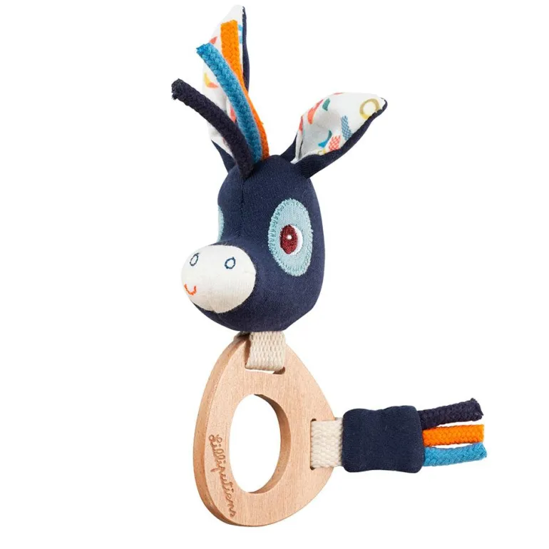 El diseño de este genial sonajero, con la cara y la cola del burrito Ignacio, captará toda su atención; el cuerpo, un mordedor de madera, es perfecto para que lo explore con la boca y alivie sus encías durante la etapa de dentición, mientras escucha los suaves sonidos del cascabel.