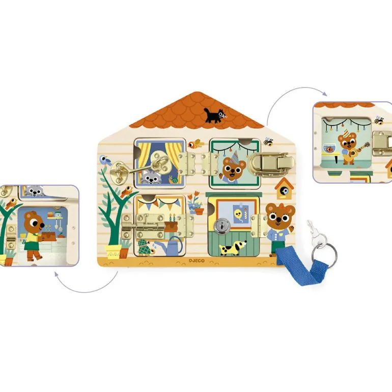 Con este original tablero con cerraduras, pondrás a prueba tu destreza manual en cada puerta, ¿conseguirás abrirlas todas? Cuando lo hayas hecho, observa lo que hace cada personaje, ¡tienes un sinfín de detalles que descubrir en cada ilustración!
