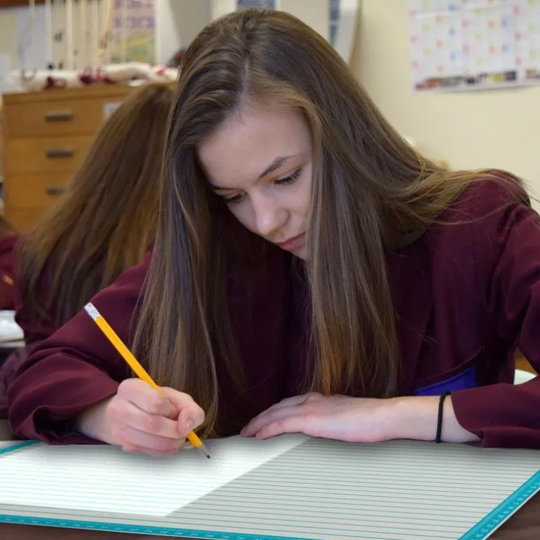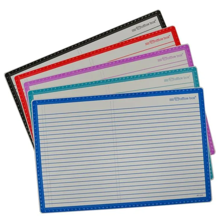 Vade de sobremesa con líneas gruesas y márgenes para colocar la hoja y conseguir un escritura correcta. Dispone de reglas laterales, evita el deslizamiento de la hoja en posición y mejora sensiblemente el trazo al reducir la fricción. Disponible en colores surtidos. Se venden por unidad.