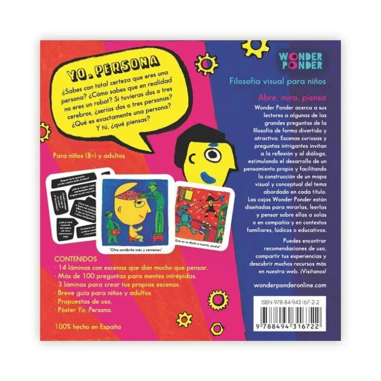 ¿Sabes con total certeza que eres una persona? ¿Cómo sabes que en realidad no eres un robot? Si tuvieras dos o tres cerebros, ¿serías dos o tres personas? ¿Y tú, qué piensas? Yo, persona es un libro-juego presentado dentro de una caja que indaga sobre quién somos y qué somos con humor, curiosidad y rigor. El sello Wonder Ponder acerca a sus lectores a algunas de las grandes preguntas de la filosofía de forma divertida y atractiva. Escenas curiosas y preguntas intrigantes invitan a la reflexión y al diálogo, estimulando el desarrollo de un pensamiento propio y facilitando la construcción de un mapa visual y conceptual del tema abordado en cada título. Para leerse a solas o en compañía, las cajas Wonder ponder están diseñadas para mirarlas, leerlas y pensar sobre ellas en contextos familiares, lúdicos o educativos.
